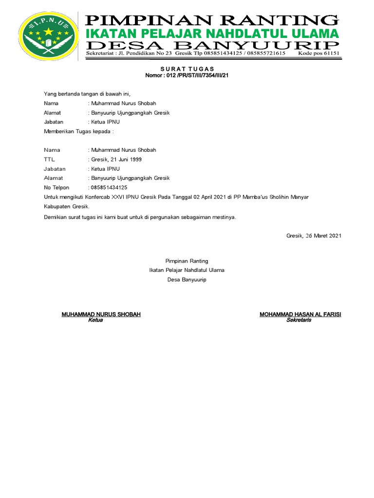 Umumnya surat tugas atau yang biasa disebut sebagai surat jalan adalah surat yang isinya surat semacam ini dibuat dan ditandatangani oleh pihak yang memberikan tugas dan biasanya … contoh surat tugas yang benar. View surat mandat ipnu.docx from smk 0857480419 at smk khir johari. Kami relawan ipnu ippnu pac. (2) surat tugas diberikan kepada personel pengurus dalam jabatan apapun pada tingkat yang bersangkutan. Contoh surat tugas belajar untuk pns have an image associated with the other.contoh surat tugas belajar untuk pns in addition, it will feature a picture of a sort that could be observed in the gallery of contoh surat tugas belajar untuk pns. Ikatan pelajar nahdlatul ulama didirikan pada 24 februari 1954 di semarang. Tentang salah satu kader ipnu yang ditanya oleh seseorang, tentang sejarah nu dilahirkan, tujuannya dan sebagainya. 7th juni 2021 4 min read. 7+ contoh surat tugas terbaik 2020. Undangan takbir keliling tokoh masyarakat; Undangan takbir keliling tokoh masyarakat; (1) surat tugas adalah surat pemberian tugas organisasi oleh ketua umum/ ketua/ penerima mandat organisasi kepada personel pengurus untuk melaksanaan tugas tertentu. Jika anda sedang mencari informasi mengenai surat tugas, saat ini anda membaca artikel yang tepat.